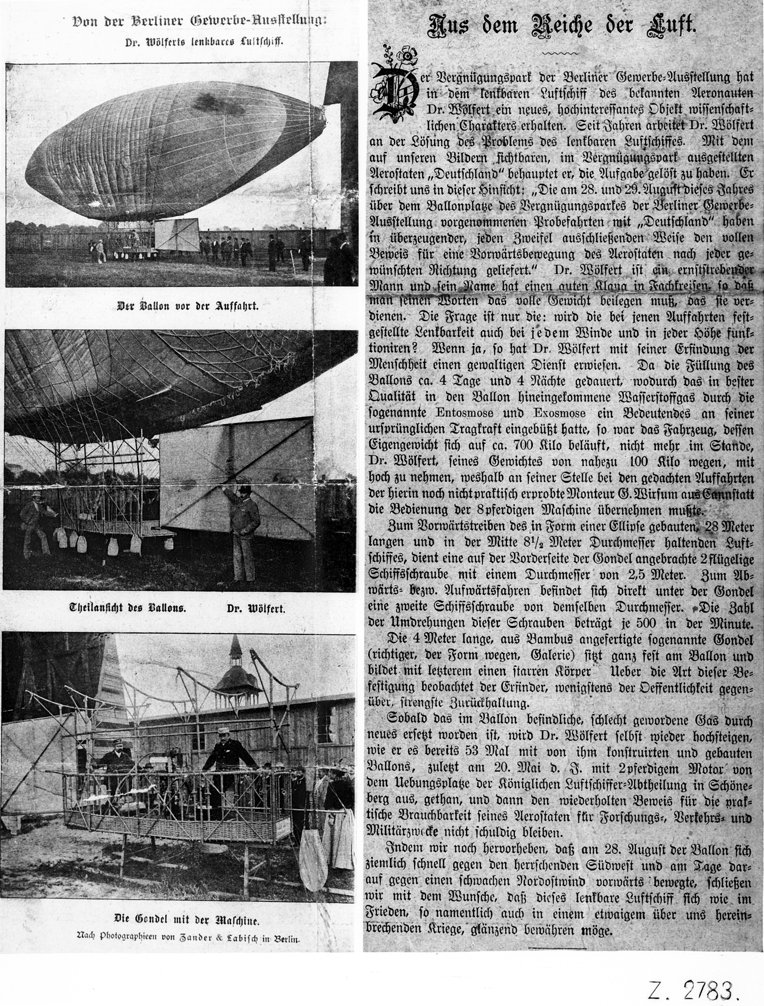 Friedrich Hermann Wolfert, rođen 1850. rano je počeo sanjariti o izgradnji letjelice. Studirao je protestantsku teologiju u Leipzigu i nakon toga tamo osnovao svoju izdavačku kuću. Godine 1880. udružio je snage sa šumarom Georgom Baumgartenom kako bi ostvario svoj san.Njih su dvojica iste godine načinili 26 m dugu letjelicuu obliku cigare. Nisu nailazili na razumijevanje svojih suvremenika, a i dnevne novine su se oglasile u začudnom tonu. I dok su pioniri avijacije napredovali u konstrukciji, bilo je očito da nemaju pouzdan izvor snage. Trebao im je lagan a snažan pogon, no nijedan raspoloživi električni i plinski motor nije se činio prikladnim. Tada ih je kontaktirao Gottlieb Daimler i preporučio benzinski motor kojega su konstruirali on i Maybach baš za letjelice. Najprije je Daimler ponudio svoj jednocilindarski motor, popularno nazvan „djedov sat“ dizajneru letjelica iz Augsburga, pa čak i pruskom ministarstvu rata, ali bez uspjeha. Prepoznao je novu priliku ujesen 1887, nakon što je pročitao članak o Wolfertovim letjelicama. Pozvao je knjižara u Cannstatt i sklopljen je dogovor o letjelici s motorom. Motor je težio 84 kg i bio smješten u gondoli letjelice. Koristeći kontrolnu ručicu, pilot je mogao primijeniti snagu motora na vertikalni i horizontalni propeler. Motor s 2 KS (1,5 kW) vrtio je propelere brzinom od 720 okretaja u minuti. Iako je jednocilindarski Daimlerov motor bio pretežak za korištenje za dulja putovanja, taj let 1888. godine dokazao je prikladnost motora s unutarnjim izgaranjem za uporabu u zrakoplovima. Kasnije je Daimler opremio motorima mnoge Graf Zeppelin letjelice, a motor s unutarnjim izgaranjem u nešto drugačijem obliku pronašao je svoje mjesto i u zrakoplovima s propelerom.