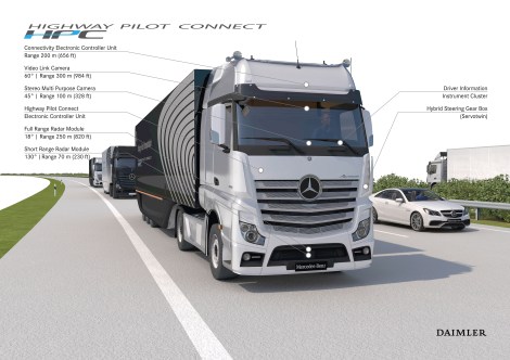 Na temelju DaimlerTrucks Highway Pilot sustava za autonomnu vožnju teških kamiona, tri kamiona su povezana i formirali aerodinamički optimiziranu, potpuno automatiziranu kolonu. Ovime su kamioni premješteni u sferu interneta koji je servis ne samo za vožnju autocestom nego povezuje sve one koji su uključeni u konkretan prijevoz: vozači, operateri flote, radionica, proizvođač i osiguravajuća društava i vlasti. Oni dobivaju informacije u realnom vremenu koja su prije bile nedostupne – o stanju tegljača i poluprikolice, prometa i vremenskim uvjetima, dostupnosti parkinga na autocestama, benzinskim postajama, odmorištima i mnogo više.