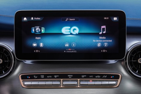 Poboljšanje MBUX-a za EQ vozila posebno je istaknuto. U zaslonu visoke razlučivosti od 10 inča, pločica EQ u glavnom izborniku služi kao središnja točka pristupa određenim postavkama samo za električna vozila. Uključuju struju punjenja, vrijeme odlaska, protok energije i histogram potrošnje. Medijski zaslon također se može koristiti za upravljanje navigacijskim i Mercedes me funkcijama, kao i načinima vožnje.
