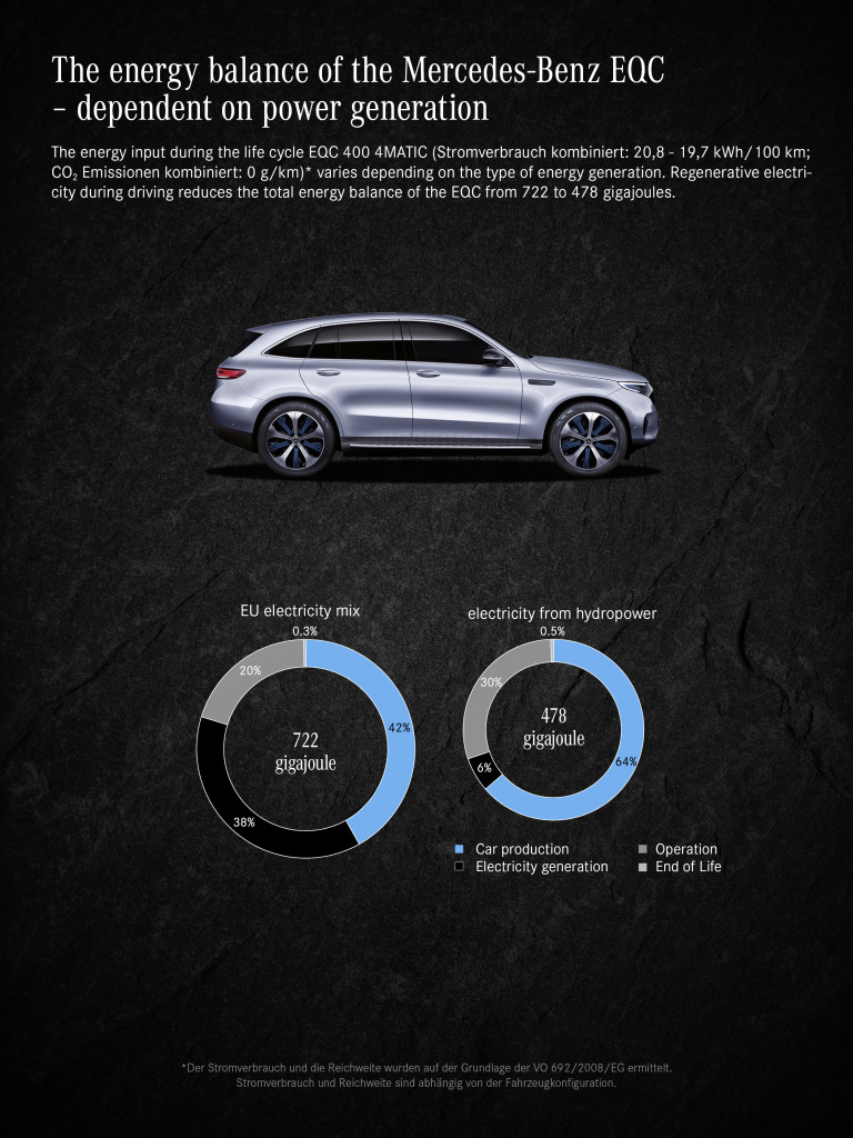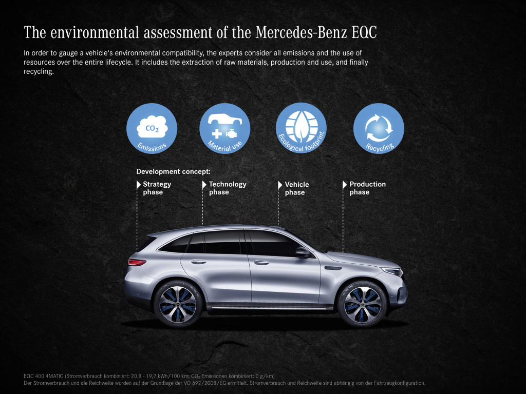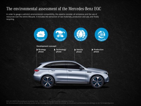 Mercedes-Benz redovito provodi ovu takozvanu provjeru okoliša, koja uzima u obzir sve aspekte zaštite okoliša, još od 2005. Proračuni se temelje na udaljenosti od 150.000 do 300.000 kilometara, ovisno o segmentu. U slučaju EQC-a to je 200.000 kilometara. Tijekom eksploatacije, ovisno o izvoru struje, električna vozila mogu nadoknaditi početno veće emisije CO2 koje nastaju tijekom proizvodnje. Ako je kupac u stanju upravljati električnim vozilom samo s obnovljivim izvorima energije, emisije CO2 u usporedbi s vozilima s motorima s unutarnjim izgaranjem smanjuje se do 70 posto tijekom životnog ciklusa.