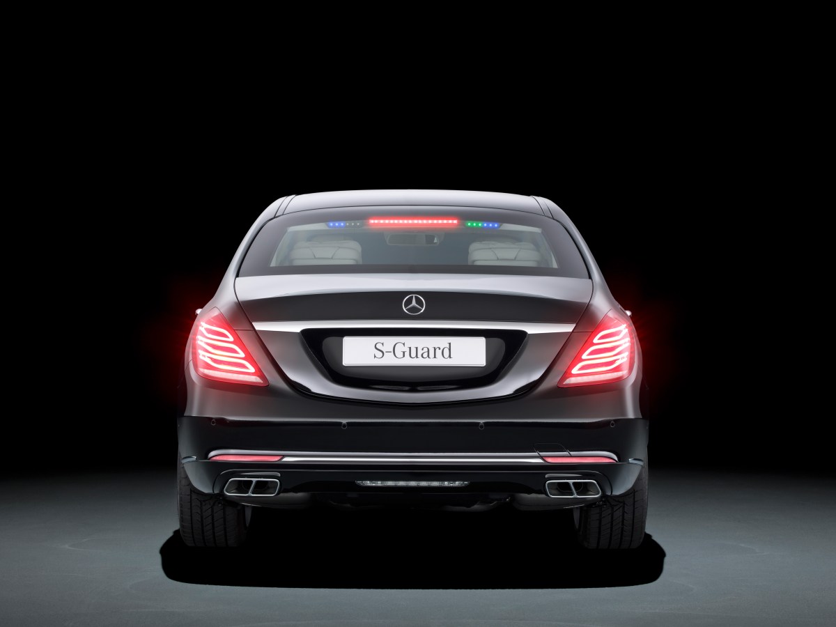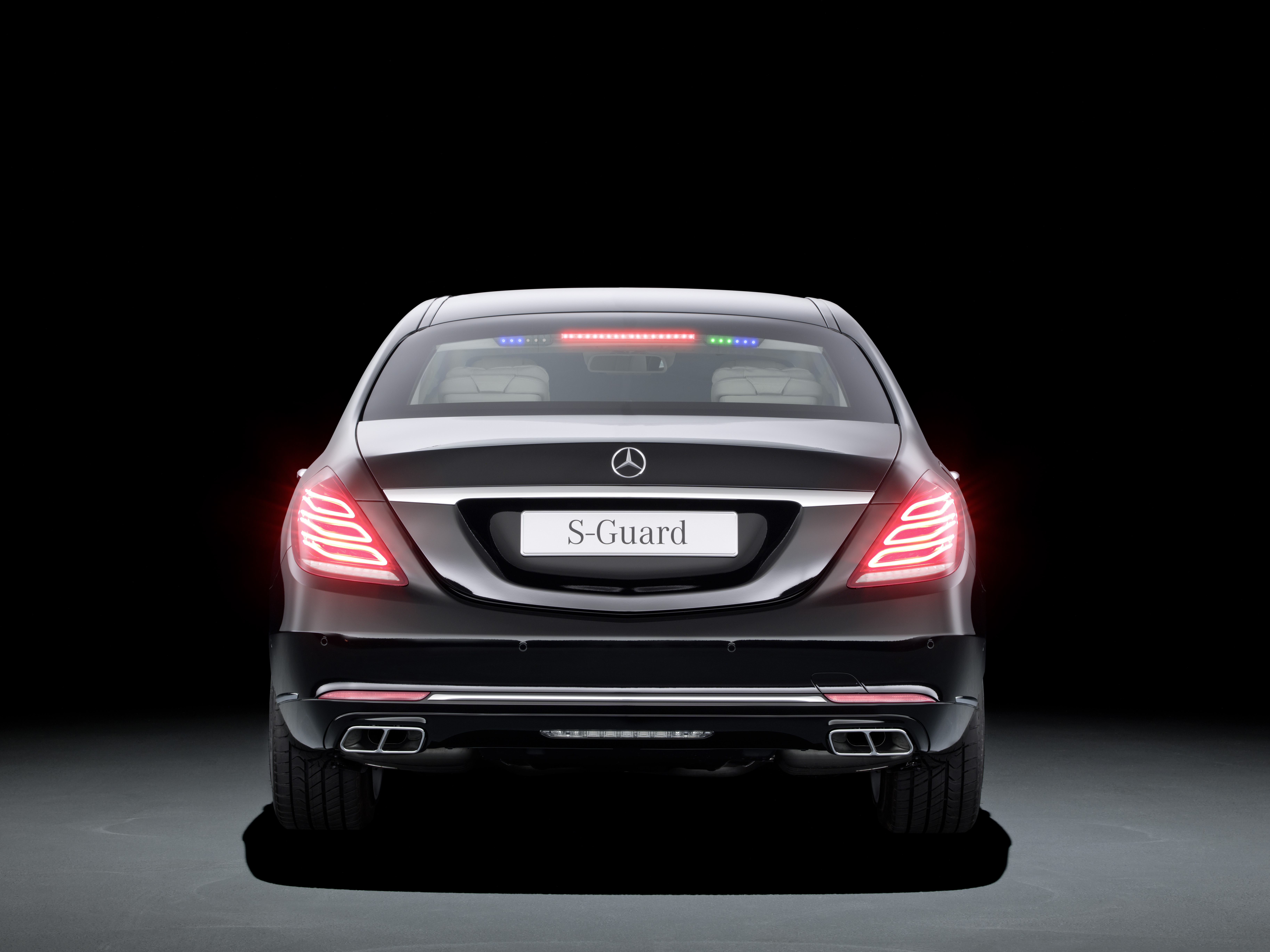 Mercedes-Benz S-Klasse Guard. Diskret integrierte LED-Lichter in der Heckscheibe als Sonderlösung für Behördenfahrzeuge.